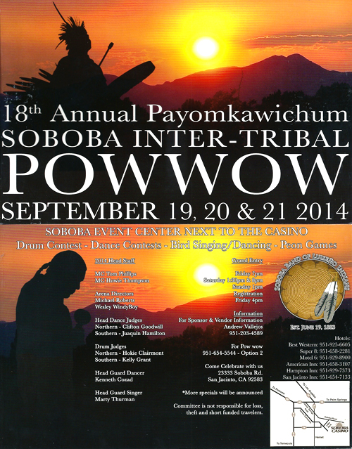 The California Valley Miwok Tribe (CVMT) received a flyer from the Soboba Band of Luiseno Indians regarding their upcoming 18th Annual Payomkawichum Soboba Inter-Tribal Pow Wow to be held on September 19, 20, & 21st, 2014, San Jacinto California.