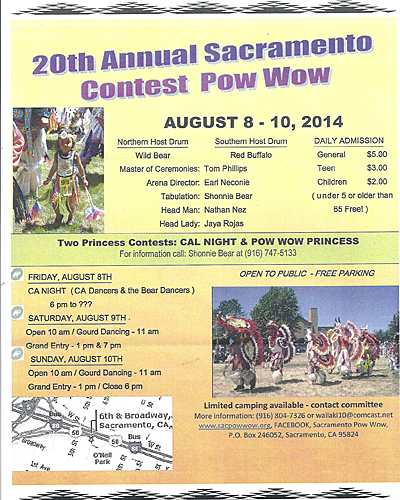 The California Valley Miwok Tribe (CVMT) received a flyer from the Sacramento Pow Wow, regarding their upcoming 20th Annual Sacramento Contest Pow Wow to be held on August 8-10, 2014, in Sacramento, CA.