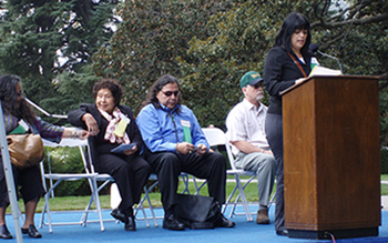 California Valley Miwok Tribe Chairperson Silvia Burley welcomes attendees to the 40th Annual California Native American Indian Day function at the state capitol in Sacramento, California.