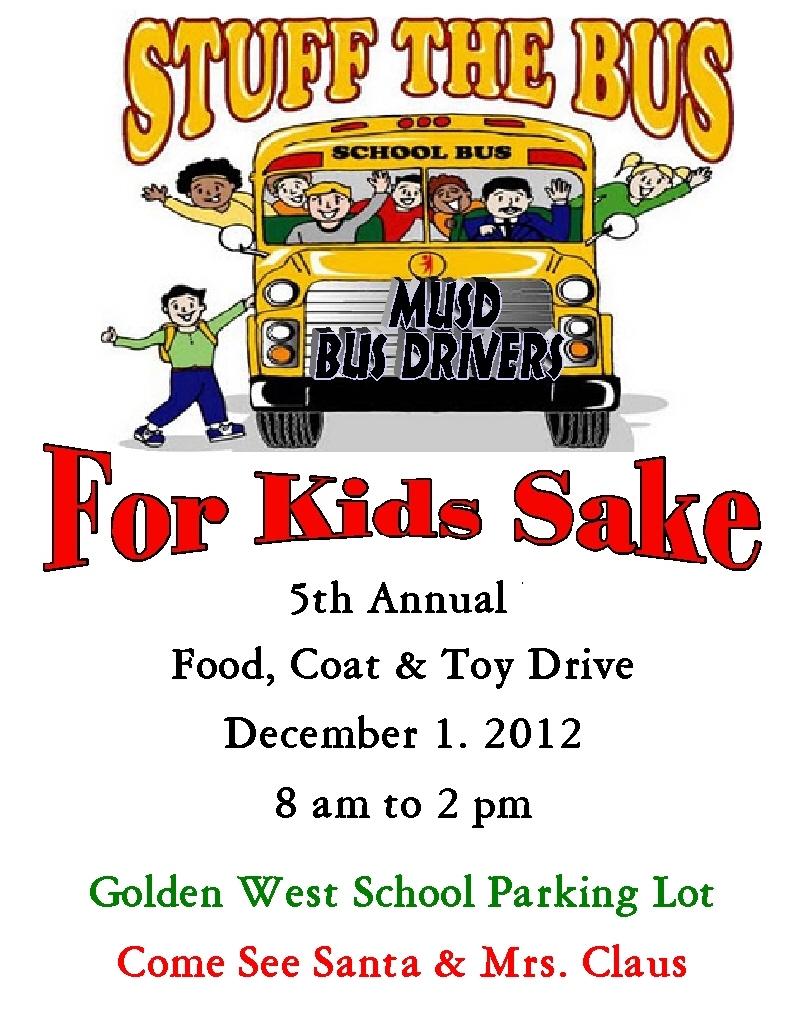 Manteca Unified School District (MUSD) bus drivers cordially invite you to join them for the “Stuff the Bus for Kids Sake” charitable event that will take place on Saturday, December 1st, 2012, from 8:00 am – 2:00 pm at the Golden West Elementary School, located at 1031 North Main Street, Manteca, CA, 95336.