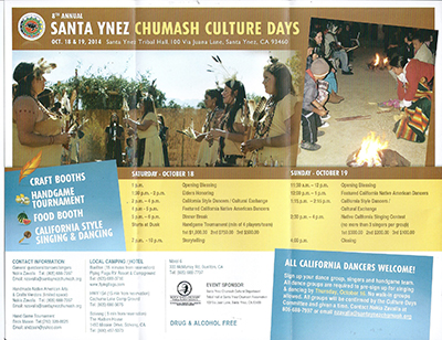 Flyer for the 8th Annual Santa Ynez Chumash Culture Days, to be held on Oct 18th-19th, 2014, in Santa Ynez, California.