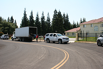 USDA food delivery truck from Tule River, driven by Food Distribution Specialist Ronald Buckman, arrives at the Tribal Office located at 10601 Escondido Place, Stockton, CA, with participants awaiting distribution.