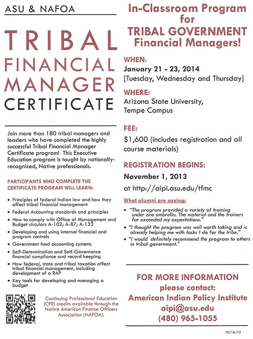 Registration began on November 1, 2013 and will continue to be accepted. The Tribal Financial Manager Certificate Program course classes are January 21st, 22nd, and 23rd, 2014, at the Arizona State University (Tempe Campus), Tempe, Arizona. The Fee is $1,600 (includes registration and all course materials).