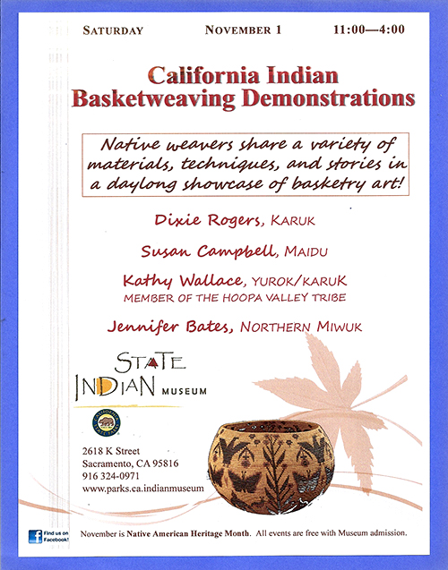 The California Valley Miwok Tribe (CVMT) received a flyer regarding the upcoming “California Indian Basketweaving Demonstrations” event to be held at the State Indian Museum in Sacramento, California.