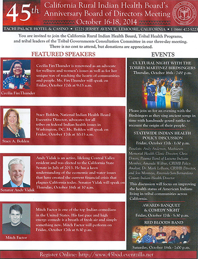 Flyer for the California Rural Indian Health Board's 45th Anniversary Board of Directors Meeting, to be held October 16th-18th, 2014, at the Tachi Palace Hotel & Casino in Lemoore, California.