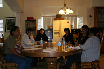 This picture was taken during a lighthearted moment in which tribal elder Mildred Burley spoke of a funny event from long ago in Indian country, to the amusement of all whom attended. Clockwise from left: Dennis Yonemura, Ione Band of Miwok Indians, Rashel Reznor, Secretary/Trasurer, California Valley Miwok Tribe, Silvia Burley, Chairperson, California Valley Miwok Tribe, Anjelica Paulk, Council Member, California Valley Miwok Tribe, Terisa Yonemura, Round Valley Reservation, Mildred Burley, Elder, California Valley Miwok Tribe.