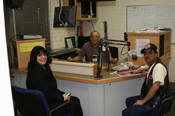 Chairperson Silvia Burley goes live on the air with Chaplin Jack Hyatt and David Romero on the 'Indian Time' radio program.