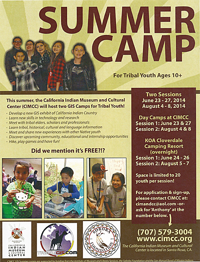The California Valley Miwok Tribe received a flyer from the California Indian Museum and Cultural Center (CIMCC) regarding two planned GIS Camps for Tribal Youth. This summer, the California Indian Museum and Cultural Center (CIMCC) will host two free GIS Camps for Tribal Youths.
