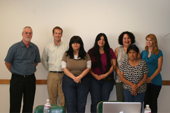 The attendees whom participated in the July 28th consultation between the California State University, Sacramento (CSUS) and the California Valley Miwok Tribe (CVMT). Clockwise from left: Charles Gosset, NAGPRA Coordinator and Dean of Social Sciences and Interdisciplinary Studies, CSUS, Jacob L. Fisher, Ph.D., Assistant Professor/NAGPRA Director, Department of Anthropology, CSUS, Anjelica Paulk, Council Member, CVMT, Silvia Burley, Chairperson, CVMT, Cristi Hunter, Collections Manager, CSUS, Mildred Burley, Tribal Artisan, CVMT and Christina Preston, NAGPRA Assistant, CSUS. Tiger Paulk, Consultant, CVMT, also in attendance (not pictured).