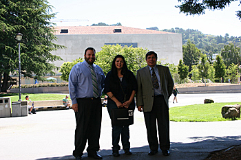 This picture was taken just outside the Phoebe A. Hearst Museum of Anthropology, on the University of California, Berkeley campus, immediately following the Tribe's consultation. Clockwise from left: Mr. Ben Garcia, Head of Interpretation and Education, Ms. Silvia Burley, Chairperson, California Valley Miwok Tribe and Mr. Anthony M. Garcia, Anthropologist/Repatriation Coordinator.