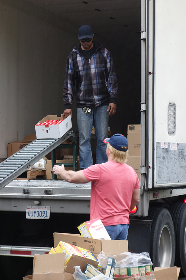 CVMT Staff, Tiger Paulk and Tule River Staff, Ron Buckman load a food allotment on the food cart. Friday, February 20, 2015 – CVMT Tribal Land, Stockton, CA 95212