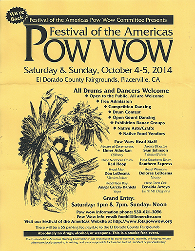 Flyer for the Festival of the Americas Pow Wow, to be held on October 4th-5th, 2014, at the El Dorado County Fairgrounds in Placerville, California.