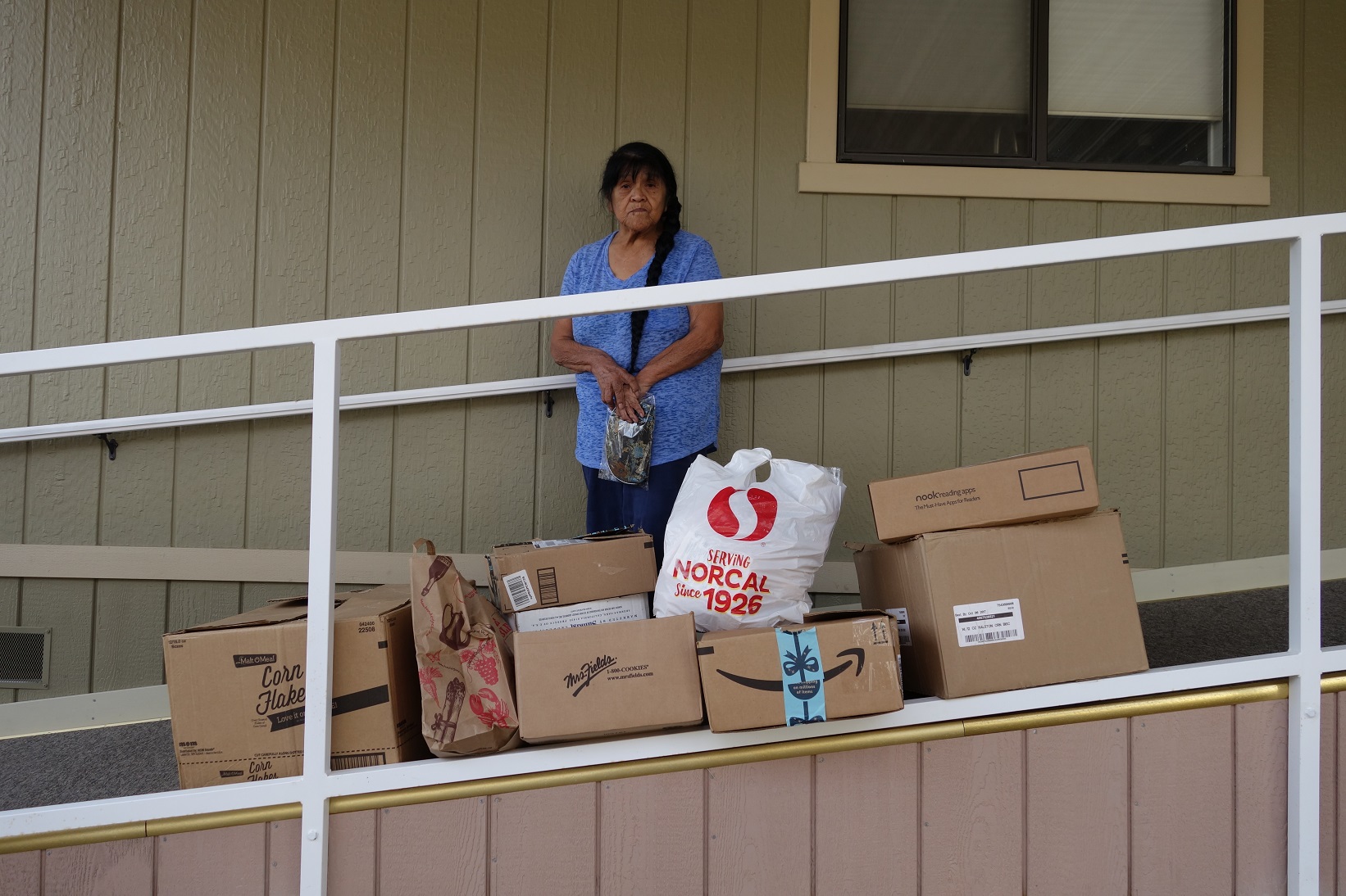 Tribe's Director of Distribution for the Food For Tribal Families Program, " Mildred Burley " stands with this month's donations. Note: For added safety this month saw outside railing installed to Mildred's handicap ramp.