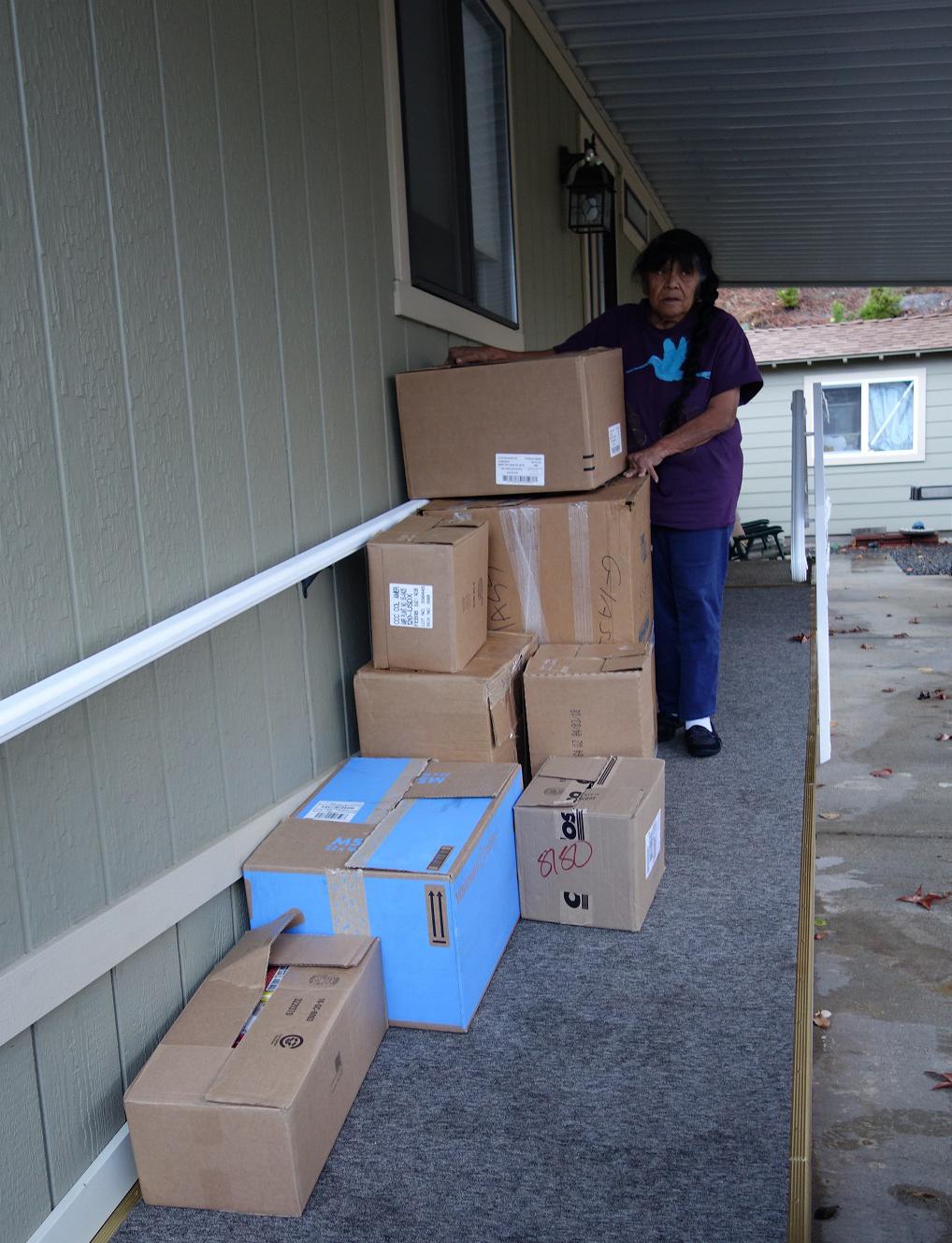 Food For Tribal Families Director and Tribal Elder, "Mildred Burley" stands with this month's delivery. Mildred will spend the next few days distributing the food and additional clothing and toys donated this month.