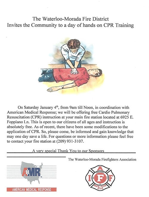 On Saturday January 4th, 2014, from 9:00 am – 12:00 noon, in coordination with the American Medical Response, the Morada Waterloo Fire District will be offering free Cardio Pulmonary Resuscitation (CPR) instruction at the main fire station located at 6925 E. Foppiano Ln., San Joaquin County, CA.