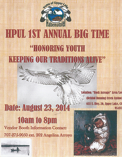 Flyer for the HPUL 1st Annual Big Time "Honoring Youth Keeping Our Traditions Alive", to be held on August 23rd, 2014, in Upper Lake, California.