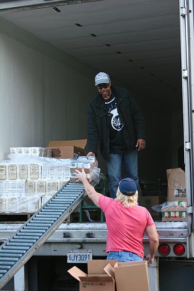 CVMT staffer Tiger Paulk assists Tule River staffer, Mr. Ron Buckman, unload USDA food allotments from the semi-truck. January 20, 2015. California Valley Miwok Tribe, Stockton, CA.