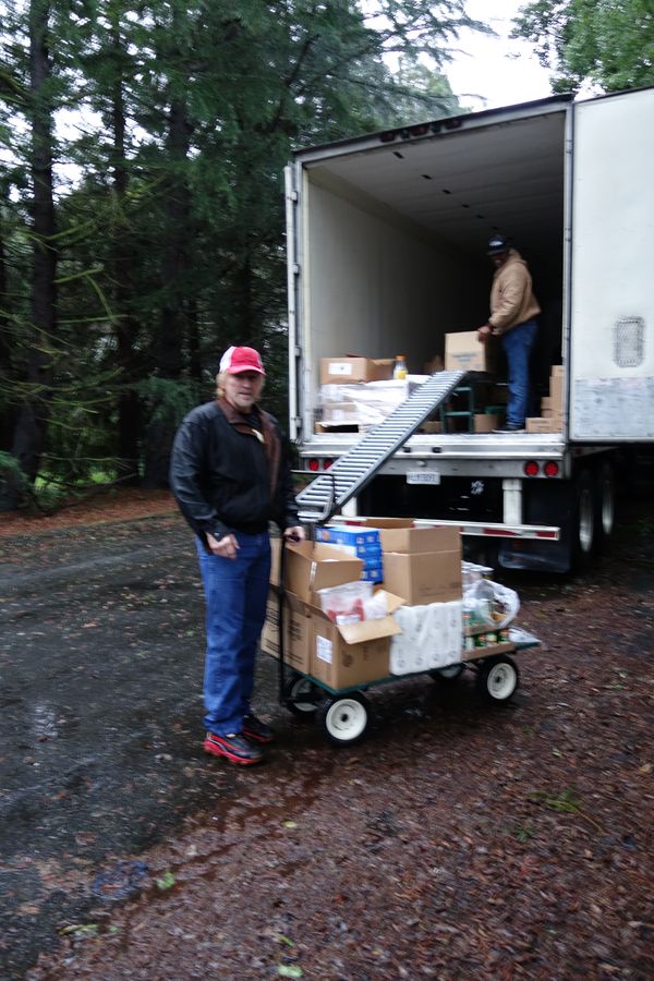 CVMT staffer Tiger Paulk stands next to a fully loaded cart of food, about to take the first of many of the day's distributions into temporary storage to await pickup by recipients, as Tule River staffer Ronald Buckman prepares another allotment at the top of the conveyer.