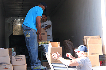 Tule River Staffer, Ronald Buckman, prepares to roll allotments of packaged canned and boxed foods down the conveyor to CVMT Staffer Tiger Paulk, as Jesus Salas stands in the background waiting to push forward more allotments. USDA Food Distribution held at the California Valley Miwok Tribe, Stockton, California on 6/18/2013