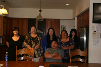 The meeting between Chairpersons Yvonne Miller and Silvia Burley and all those in attendance clockwise from left: Anjelica Paulk, Council Member, California Valley Miwok Tribe, Yvonne Miller, Chairperson, Ione Band of Miwok Indians, Silvia Burley, Chairperson, California Valley Miwok Tribe, Atta Stevenson, President (CIWC), Cahto Tribe, Rashel Reznor, Secretary/Treasurer, California Valley Miwok Tribe, Sitting: Randy Yonemura, Project Director, (CIWC), Ione Band of Miwok Indians, Tiger Paulk, Consultant, California Valley Miwok Tribe (not pictured).