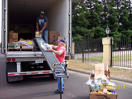 CVMT staffer Tiger Paulk assists Tule River staffer, Mr. Ron Buckman unload the USDA food allotments from the semi-truck. California Valley Miwok Tribe, Stockton, CA.