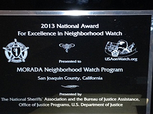 Each year only three (3) of these awards are given out in the entire nation. Morada’s NW got one of those three awards. On Tuesday, August 27, 2013 the San Joaquin County Sheriff Steve Moore presented Donna Augustine with a plaque award that says. “2013 National Award for Excellence in Neighborhood Watch, presented to Morada Neighborhood Watch Program, San Joaquin County, California – Presented by The National Sheriff’s Association and the Bureau of Justice Assistance, Office of Justice Programs, U.S. Department of Justice”.