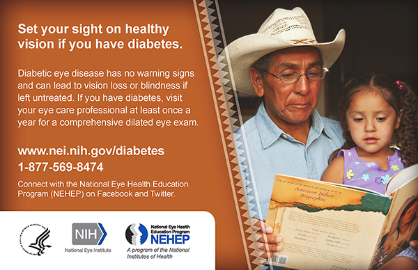 Each year in November, National Diabetes Month is observed and the National Eye Health Education Program (NEHEP) continues educating the American Indian and Alaskan Native community on the topic of diabetic eye disease to avoid blindness among our people. People with diabetes should have a dilated eye exam at least one a year to detect diabetic eye disease in its early stages. Diabetic eye disease refers to a group of eye problems that people with diabetes may face as a complication of the disease and includes cataract, diabetic retinopathy, and glaucoma. Diabetic retinopathy, the most common diabetic eye disease, is the leading cause of blindness in adults 20-74 years of age.