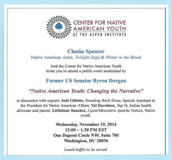A flyer for the Center for Native American Youth at the Aspen Institute “Native American Youth: Changing the Narrative” Lunch Event 11/19/2014 with Cheaske Spencer, Native American Actor.