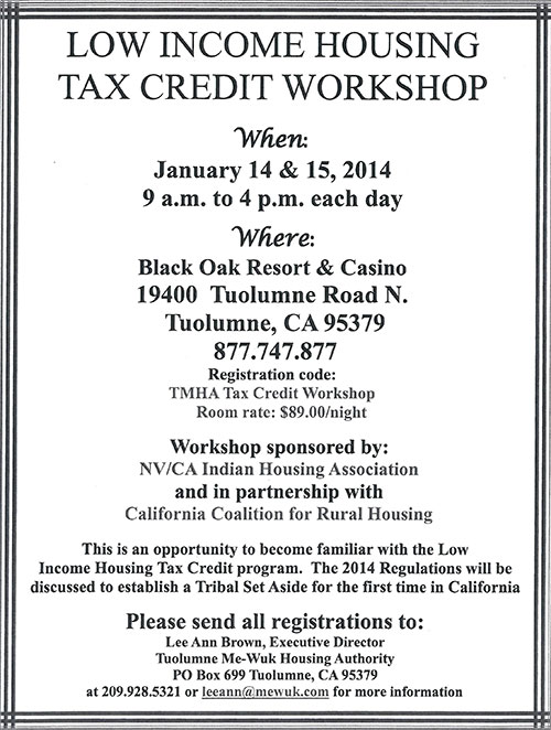The California Valley Miwok Tribe (CVMT) received a flyer and accompanying information from the Tuolumne Me-Wuk Housing Authority regarding an upcoming Low Income Housing Tax Credit Workshop sponsored by the Nevada California Indian Housing Association and in partnership with the California Coalition for Rural Housing.