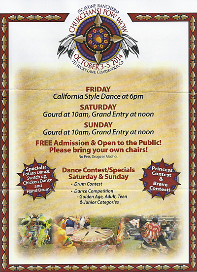 The California Valley Miwok Tribe (CVMT) received a flyer from the Picayune Rancheria of the Chukchansi Indians regarding their upcoming Pow Wow scheduled for October 3-5, 2014, 711 Lucky Lane, Coarsegold, California.