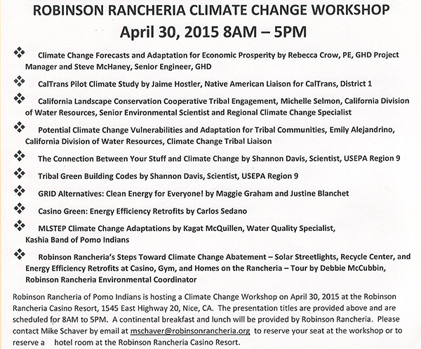 The California Valley Miwok Tribe (CVMT) received a flyer regarding the upcoming Climate Change Workshop hosted by the Robinson Rancheria of Pomo Indians.