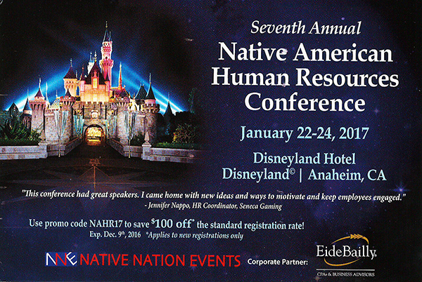 Over 400 Human Resource Directors, CFOs, Tribal Representatives and Service Providers will come together on January 22nd-24th, 2017 in Disneyland to hear from top experts in the human resources field and learn tangible and practical skills to take back into their workplace. This year’s curriculum will also include hands-on intensive training with our Pre-Conference Workshops (additional charge).