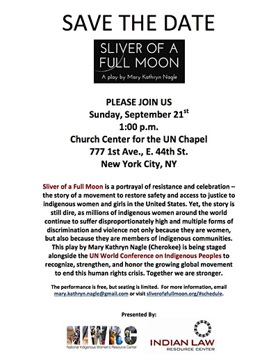 Sliver of a Full Moon is a portrayal of resistance and celebration – the story of a movement to restore safety and access to justice to indigenous women and girls in the United States. Yet, the story is still dire, as millions of indigenous women around the world continue to suffer disproportionately high and multiple forms of discrimination and violence not only because they are women, but because they are members of indigenous communities. This play by Mary Kathryn Nagle (Cherokee) is being staged alongside the UN World Conference on Indigenous Peoples to recognize, strengthen, and honor the growing global movement to end this human rights crisis. Together we are stronger.