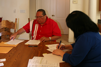 Historical Signing: Chairperson Silvia Burley is a signatory for the California Valley Miwok Tribe. Mr. Terry Snowball, NMAI Repatriation Coordinator makes sure that all appropriate documents are signed and in order. Signing held on June 18, 2013 at 10601 N. Escondido Pl., Stockton. California.