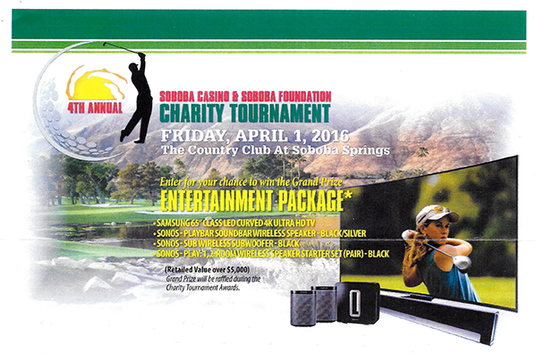 The California Valley Miwok Tribe received a letter from the Soboba Band of Luiseno Indians, announcing the 4th annual Soboba Foundation Charity Golf Tournament to be held on April 1, 2016 at The Country Club at Soboba Springs. The goal of the event is to raise and donate $100,000 to non-profit groups and charities.