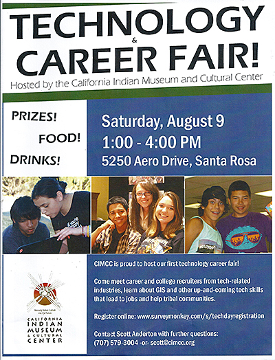Flyer for the Technology & Career Fair, to be held on August 9th, 2014, at the California Indian Museum and Cultural Center in Santa Rosa, California.