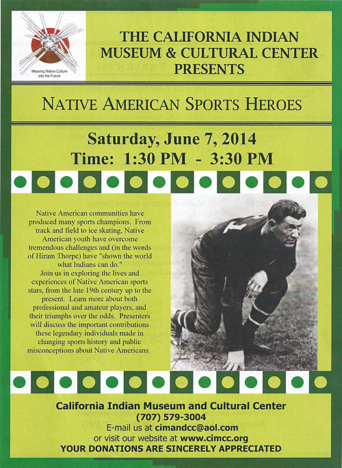 Flyer for the Native American Sports Heroes presentation, to be held on June 7th, 2014, at the California Indian Museum & Cultural Center, Santa Rosa, California.