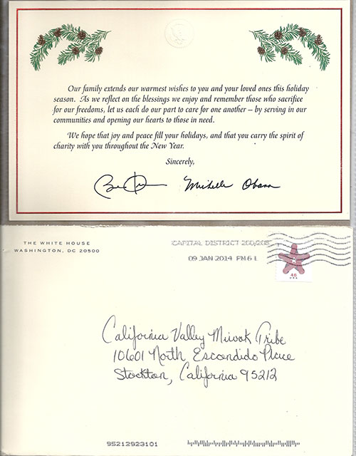 The California Valley Miwok Tribe (CVMT) received a Greeting Card from The White House signed by President Barack Obama and First Lady Michelle Obama.