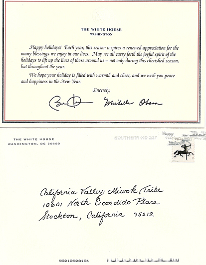 On Thursday, December 20th, 2012, the California Valley Miwok Tribe was elated to receive a Happy Holidays card from the White House, signed by President Barack Obama and First Lady Michelle Obama.