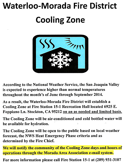 When: The community will be notified of the Cooling Zone days and hours of operation through the Morada Area Association email system. The Cooling Zone will be open to the public based on local weather forecast, the NWS Heat Emergency Phase criteria and as determined by the Fire Chief. According to the National Weather Service, the San Joaquin Valley is expected to experience higher than normal temperatures throughout the month’s of June through September 2014.