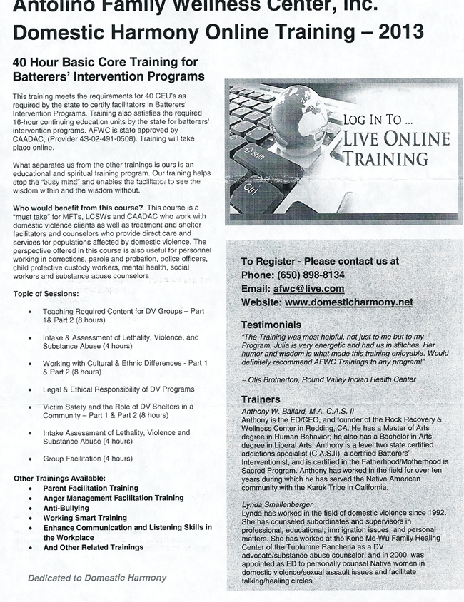 AFWC, Inc. has provided 40 hour basic core training for Batterers’ Intervention Programs for California Native TANF and other trainings for Two Feathers in Northern California, Oneida Nation in Wisconsin, community organizations and tribes in Nevada, and to CRIHB (California Rural Indian Health Board) in Sacramento, California.